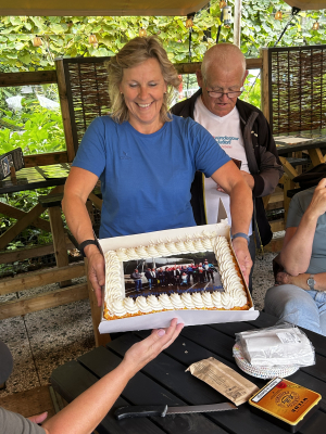 Op 23 augustus hebben we dat jubileum gevierd met 's morgens eerst een wandeling van 5 of 10 km in het Amsterdamse Bos met 22 leden en oud leden, gevolgd door koffie bij Meerzicht. Ondertussen was een ander deel van de groep al bezig met de voorbereidingen van de BBQ. Deze hebben we bij wandelaars Sandra en René in hun tuin in Aalsmeer mogen doen. Om 17.30 uur druppelde iedereen binnen met zelfgemaakte hapjes en ging de bbq aan. Rond 18.00 uur hebben we met een korte speech en een boodschap van het bestuur het feest afgetrapt en er met z'n 33-en een gezellige avond van gemaakt.